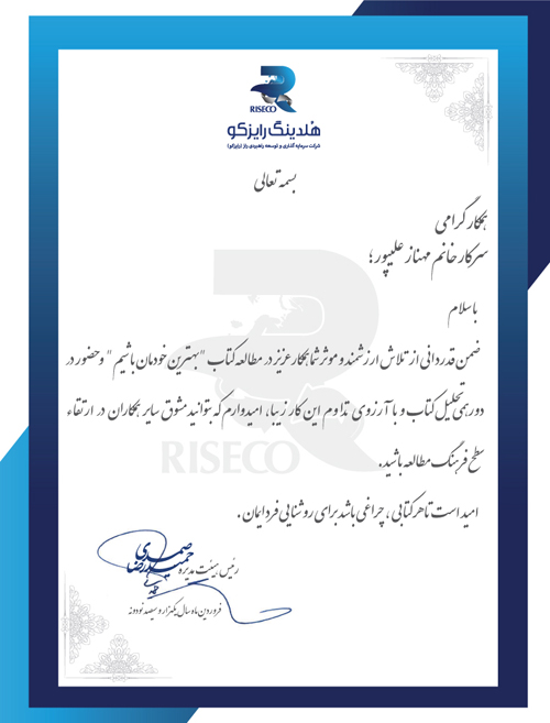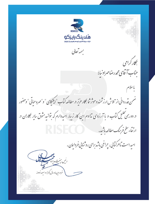 اعلام برنده های فراخوان شماره ۱ هلدینگ رایزکو و تقدیر ریاست محترم هیئت مدیره هلدینگ رایزکو از همکارانی که در دورهمی تحلیل کتاب حضور یافتند آوریل 20, 2020پرتو